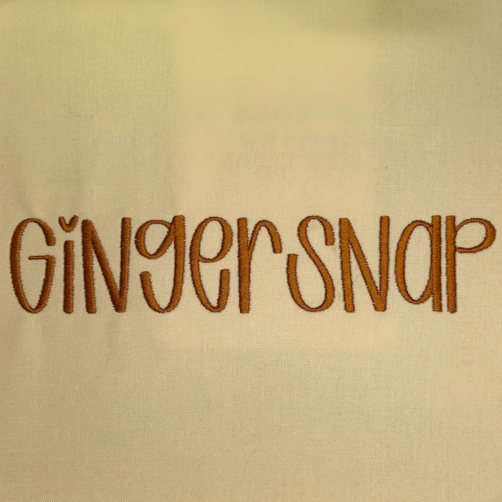 Gingersnap is a tall, sweet and slightly spicy embroidery font ready to warm up your hoop. Each letter is hand‑digitized with a consistent, steady stitch—no auto‑magic here—so every character has a personality all its own. The slender strokes and playful curls keep it legible yet stylish, and little hearts dotting the i’s add a mischievous wink. With uppercase letters, numbers, punctuation and fun symbols, Gingersnap is perfect for holiday stockings, kitchen towels, aprons and everyday projects that need a dash of whimsy. Zero calories, all the charm—grab your machine and sprinkle some sweetness across your creations.